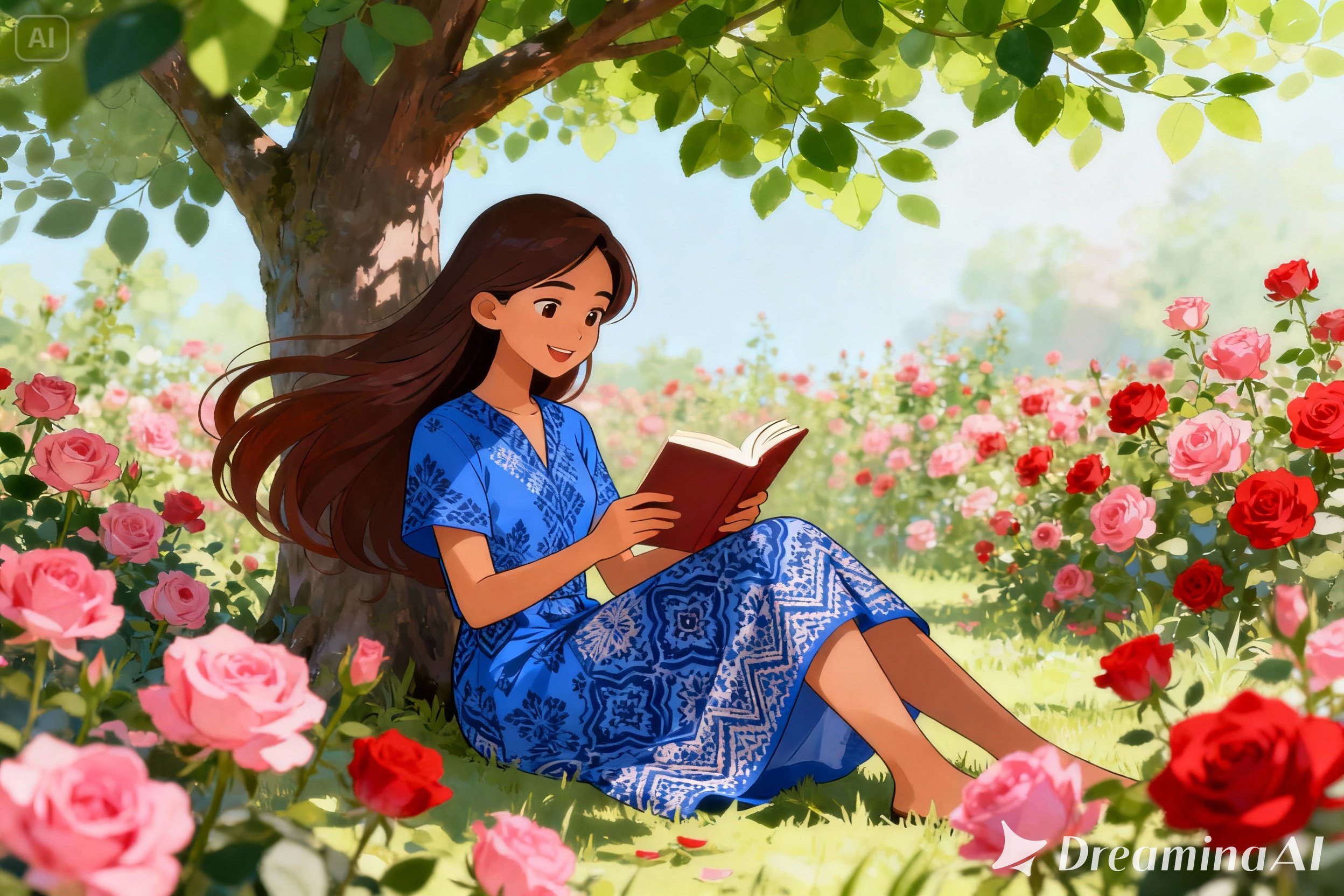 Contoh Gabungan: Seorang wanita muda Indonesia dengan rambut panjang tergerai, mengenakan gaun batik modern berwarna biru, sedang duduk santai membaca buku di bawah pohon rindang di sebuah taman bunga yang penuh mawar.