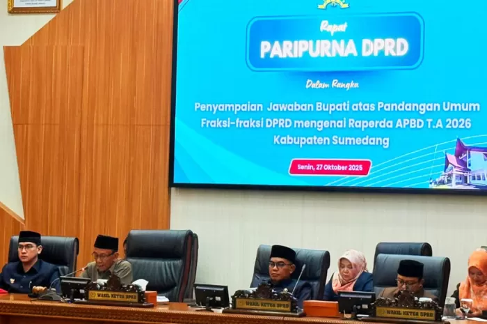 JatiNetwork.Com – Dewan Perwakilan Rakyat Daerah (DPRD) Kabupaten Sumedang menggelar rapat paripurna dengan agenda penyampaian jawaban Bupati Sumedang atas pandangan umum fraksi-fraksi DPRD terhadap Raperda tentang APBD Tahun Anggaran 2026, Senin (27/10/2025).