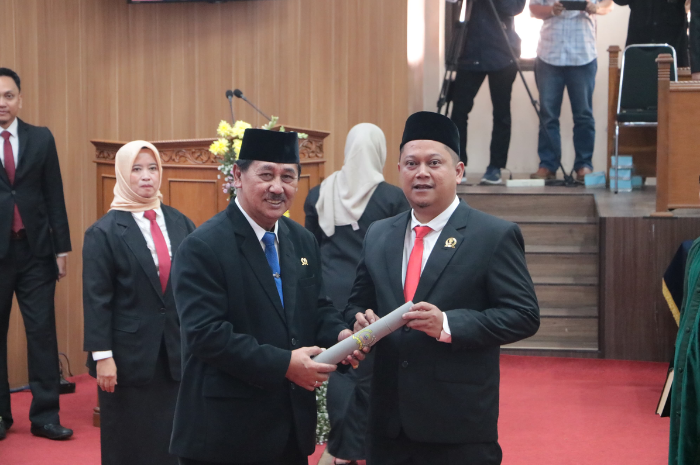 Usai pengucapan sumpah, Hendri Darmawan secara simbolis menerima penyematan pin DPRD dan penandatanganan berita acara pelantikan oleh Ketua DPRD.