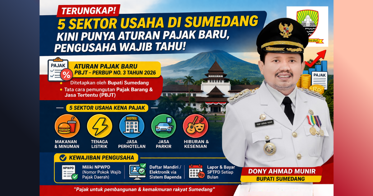 - Bupati Sumedang menetapkan Peraturan Bupati Nomor 3 Tahun 2026 tentang tata cara pemungutan Pajak Barang dan Jasa Tertentu (PBJT).